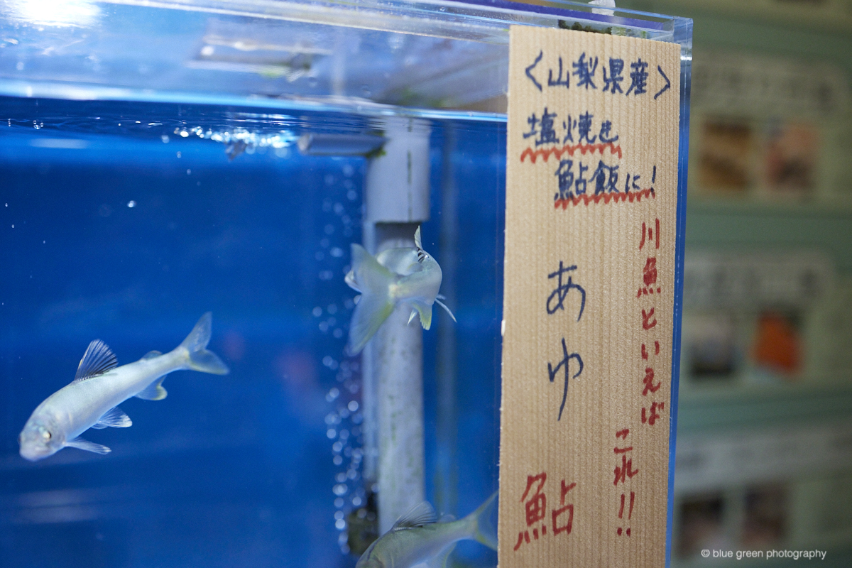 そして綺麗なアユ。山梨県産らしい。塩焼きも鮎飯も美味しそうだ。